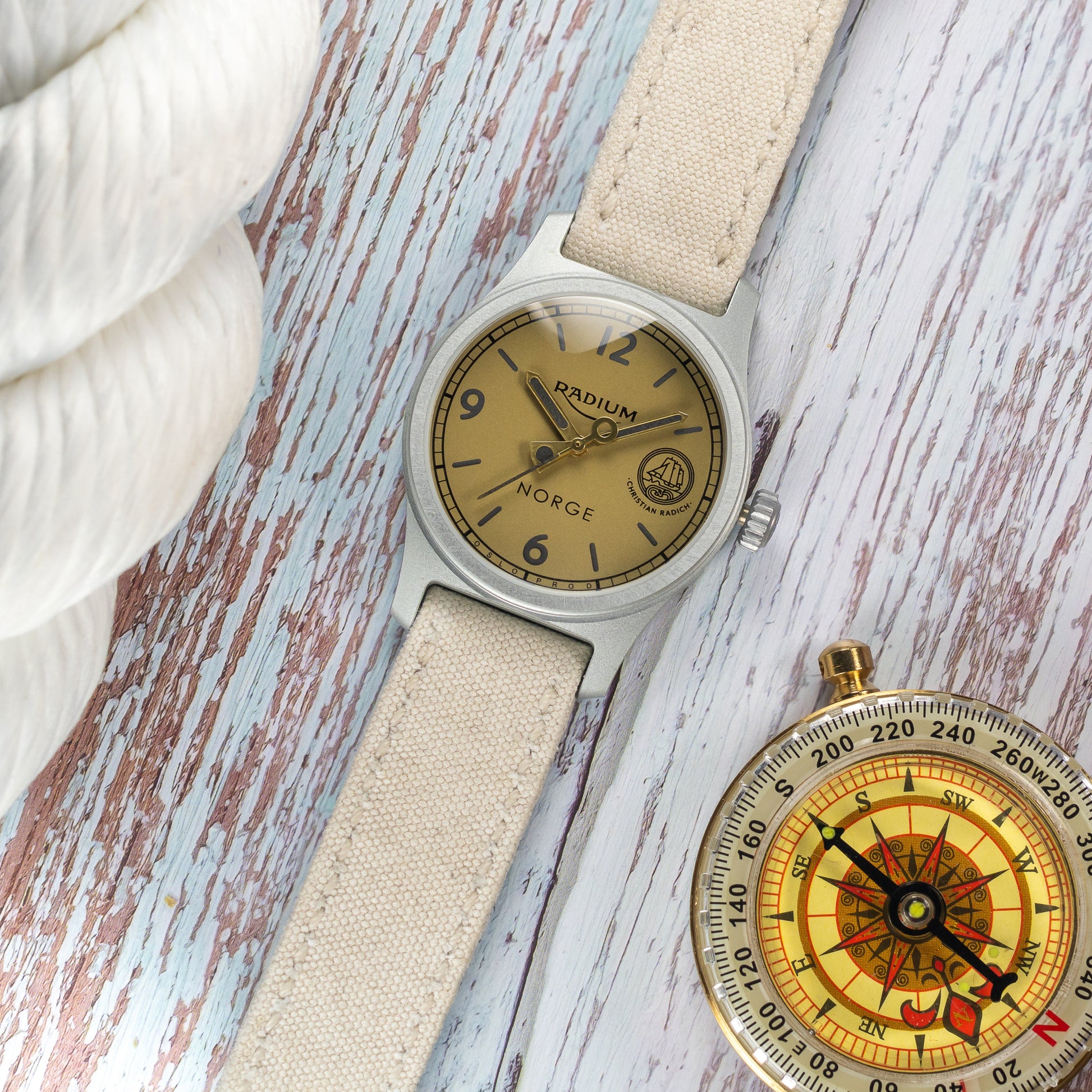 Denne klokken leveres med to ulike remmer: standardremmene, og Christian Radich Mainsail-remmene, som er håndlaget av hovedseilet til den legendariske skuten. Mer autentisk blir det ikke.