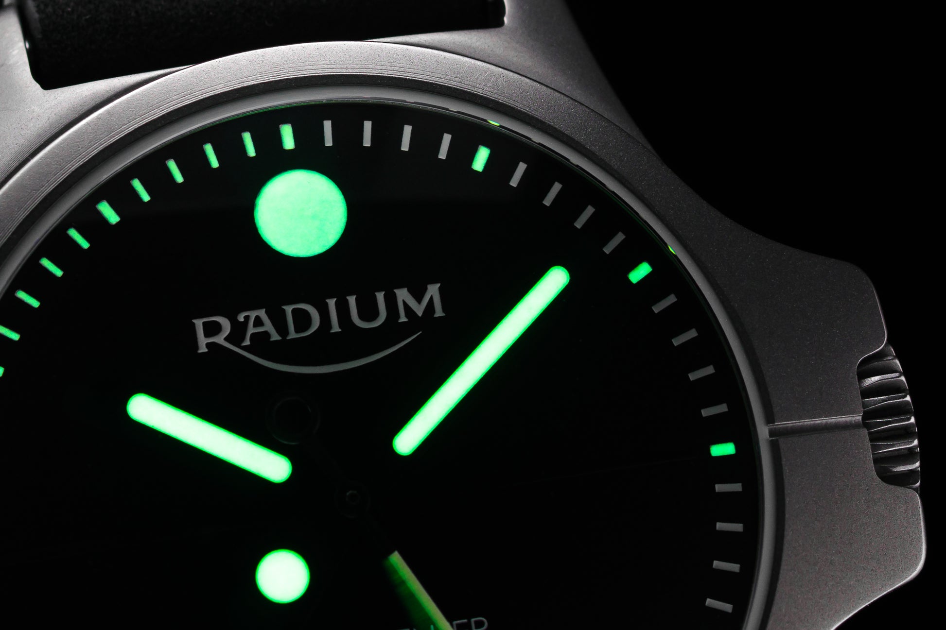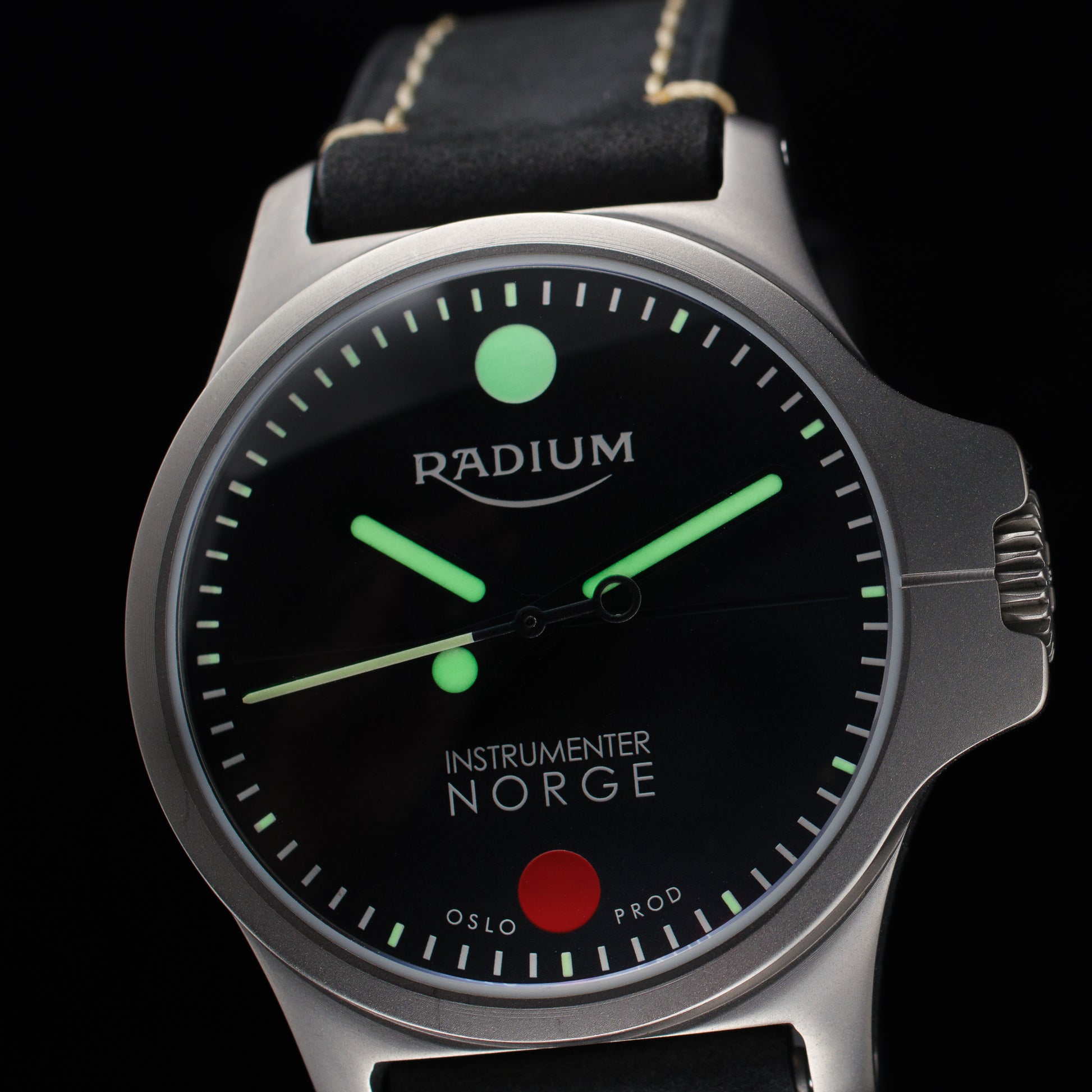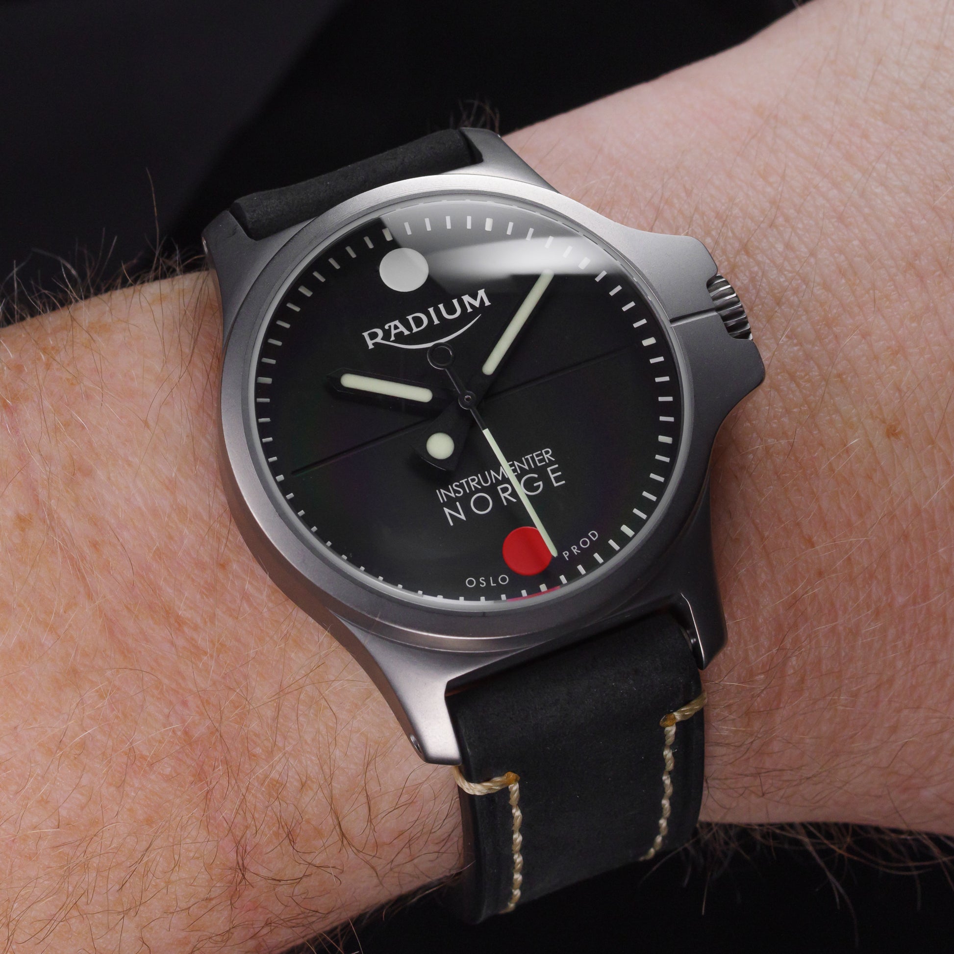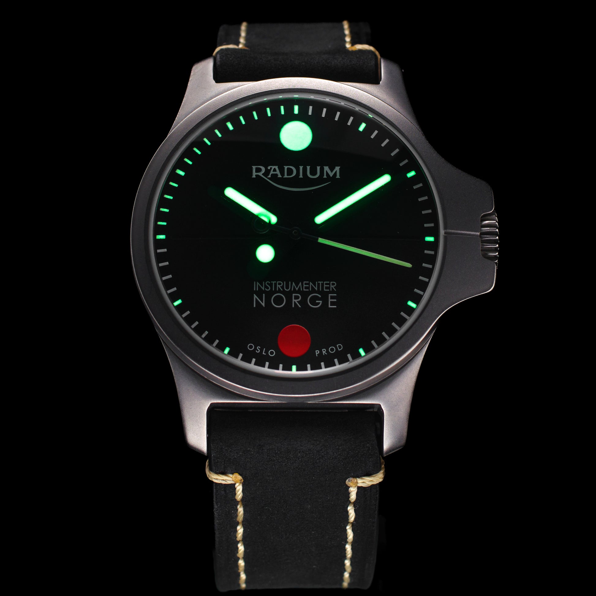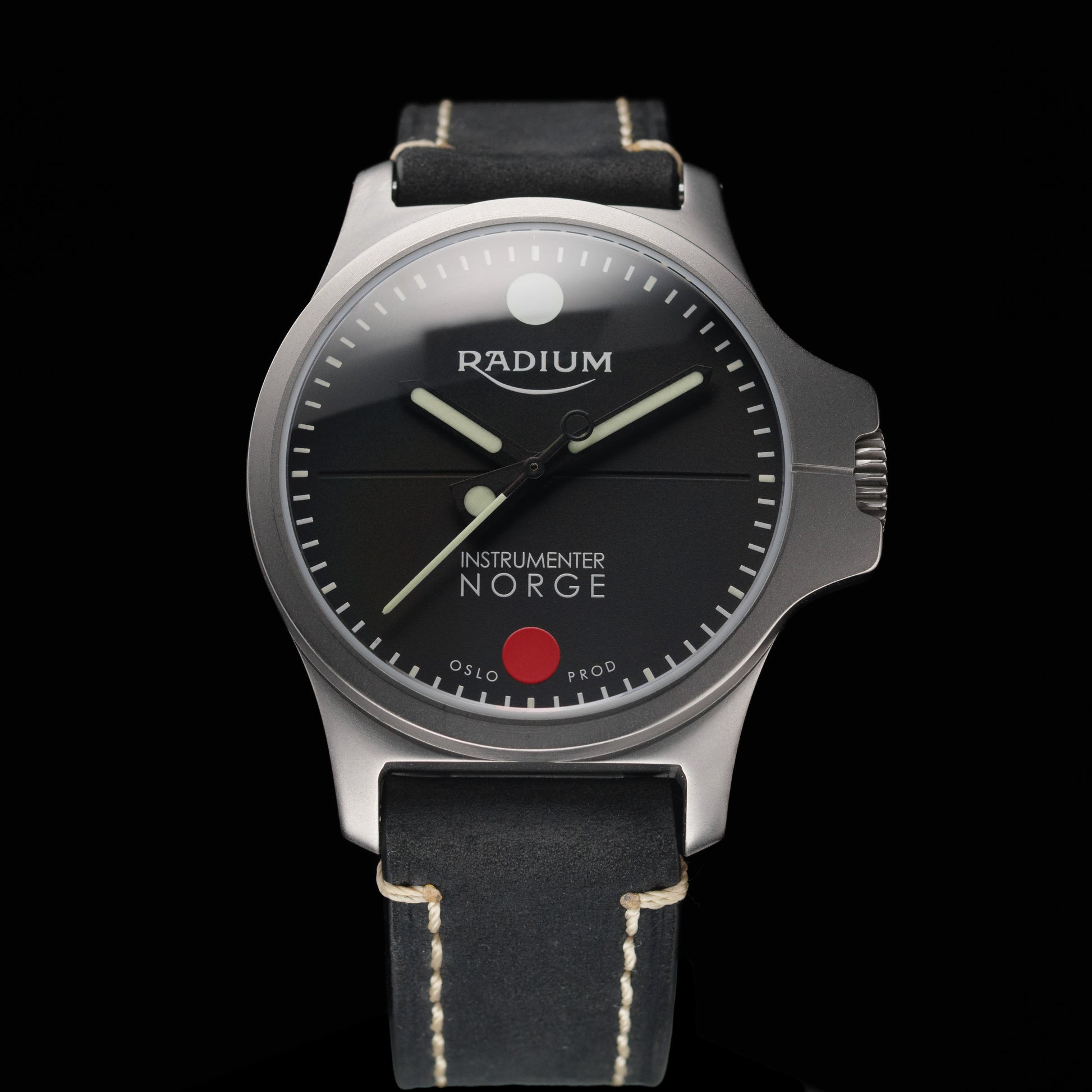 Tallskiven har SuperLuminova lysstoff på timeindeksene, og fra 00:45 til 00:00 også lysstoff på minuttindekser for enklere nedtelling i mørket. Radium DUO er en ekstremt lettlest klokke med påfallende instrumentpreg. Fremstilt i klasse fem titan for lav vekt og overlegen slitestyrke.